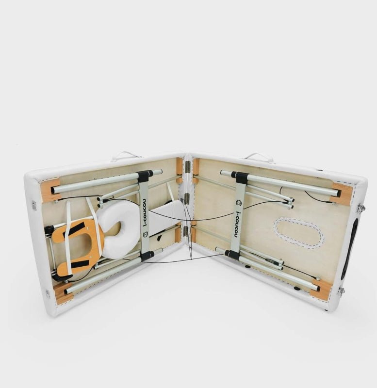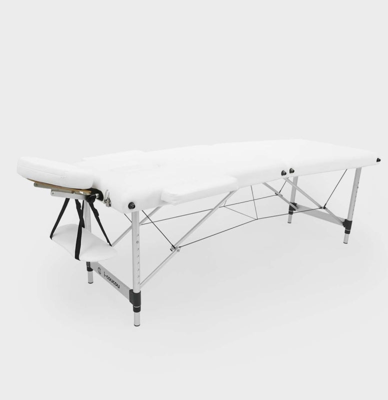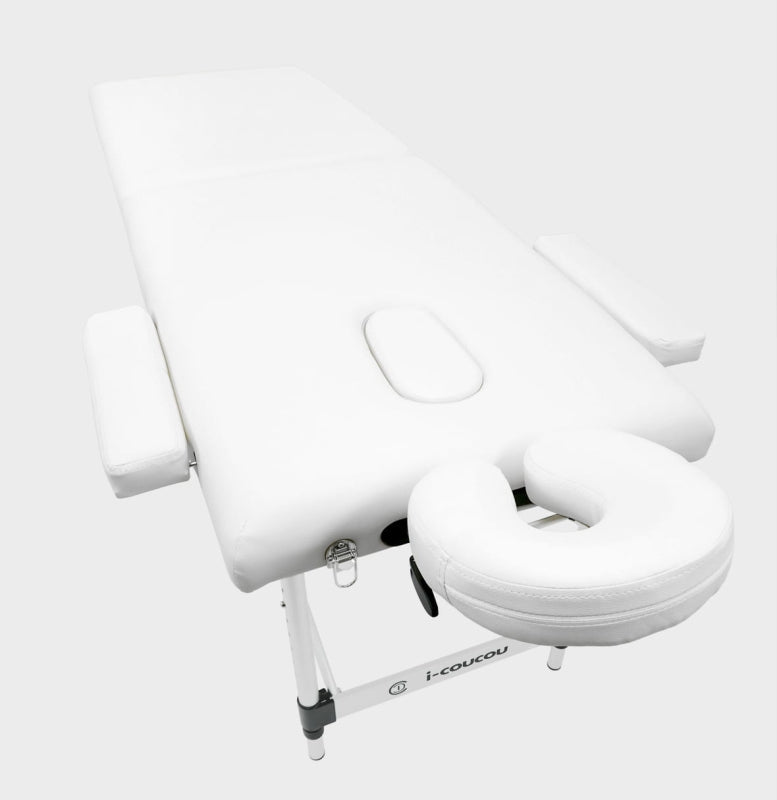 Das Kosmetikbett i-coucou eignet sich hervorragend für kosmetische Behandlungen und in der Massagetherapie. Sehr stabil und leicht dank Aluminiumrahmen und Stahlseilen.