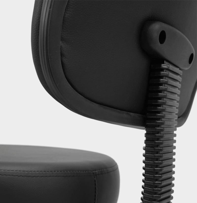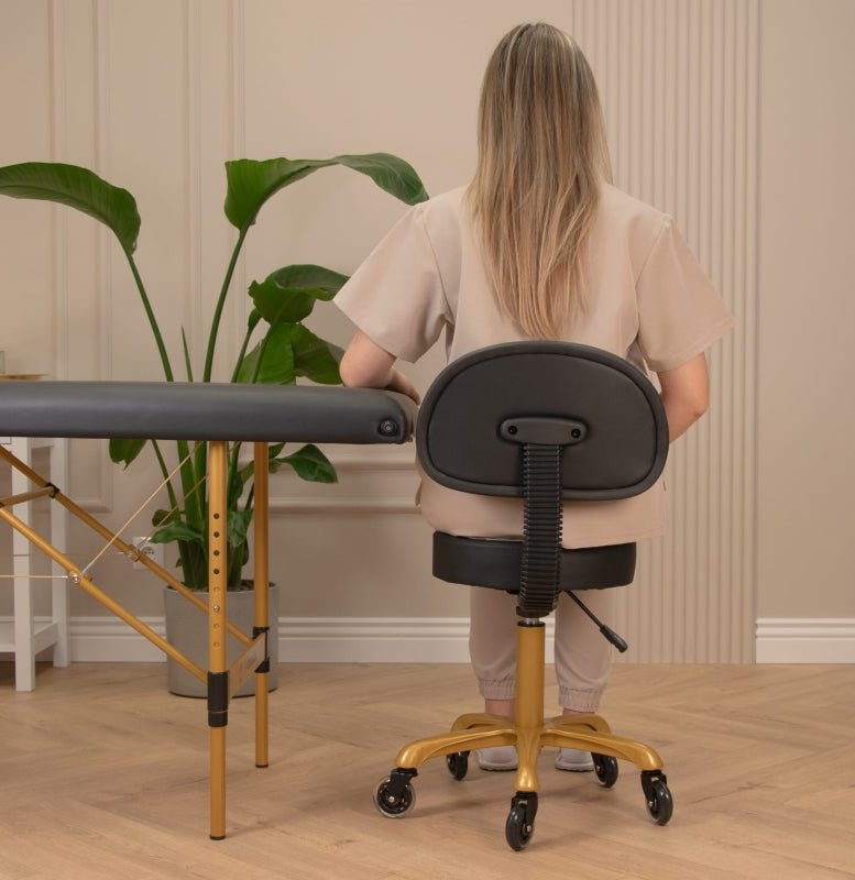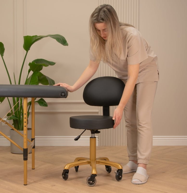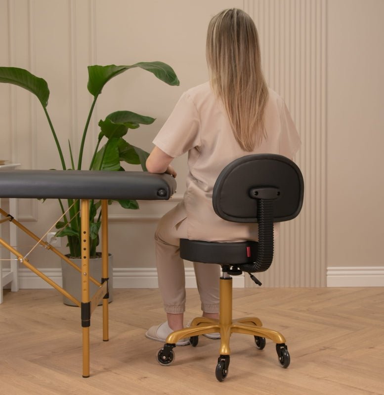 Der Kosmetikstuhl mit Rückenlehne ist ein Möbelstück, das Funktionalität, Komfort und elegantes Design vereint. Dank der besonders breiten Sitzfläche von 40 cm und einer 8 cm dicken Polsterschicht bietet er auch bei langen Arbeitsstunden hohen Komfort. Der Bezug aus hochwertigem Kunstleder mit dekorativen Nähten sieht nicht nur stilvoll aus, sondern ist auch leicht zu reinigen – beständig gegen Reinigungsmittel, Öle und Wasser, was höchste Hygienestandards im Studio gewährleistet. Drehbare Gummiräder erleichtern die Mobilität und das freie Bewegen, ohne aufstehen zu müssen.